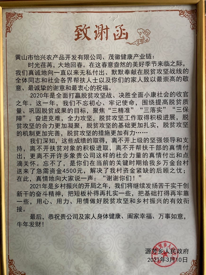 2021年3月15日,黃山市怡興農(nóng)產(chǎn)品開發(fā)有限公司收到來自源芳鄉(xiāng)人民政府的一封《致謝函》。